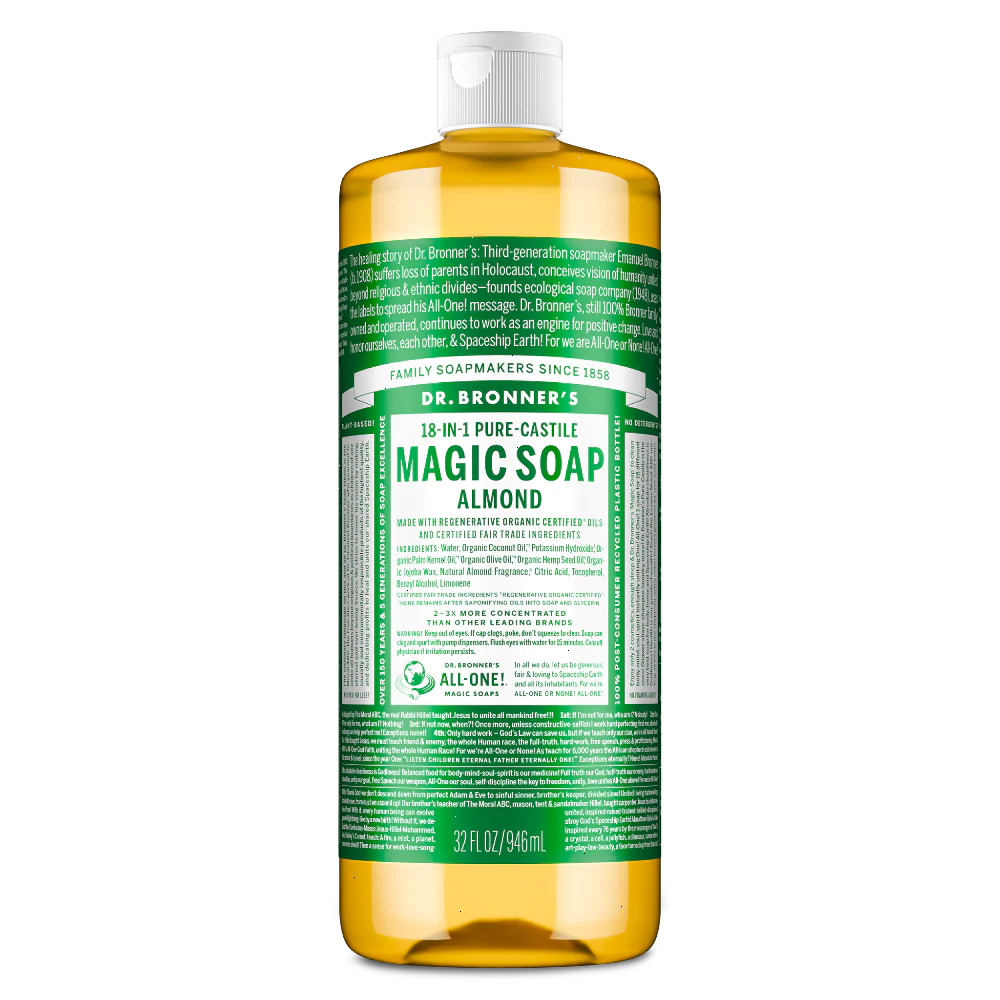 Warm, nutty, and slightly sweet—Dr. Bronner’s Almond Liquid Soap delivers a rich, comforting experience! Made with Regenerative Organic Certified® oils, this true soap creates a rich, smooth lather that leaves you feeling renewed and rinses clean. Made with organic, ethically sourced ingredients and no detergents, dyes, or added foaming agents, it’s a great soap for everyday use. Vegan, made with organic oils, fair trade, and EWG Verified®—a clean that cares for you and the planet!