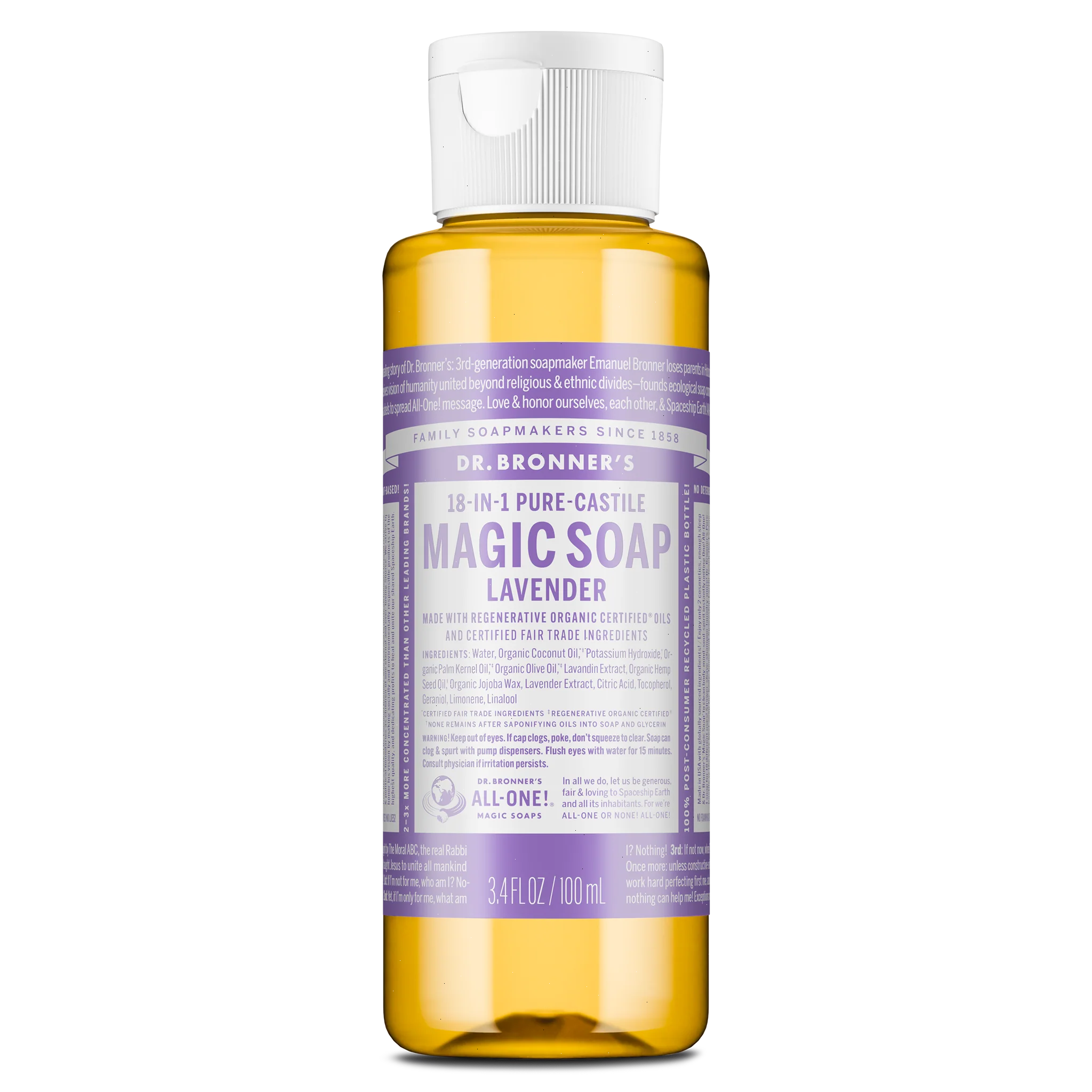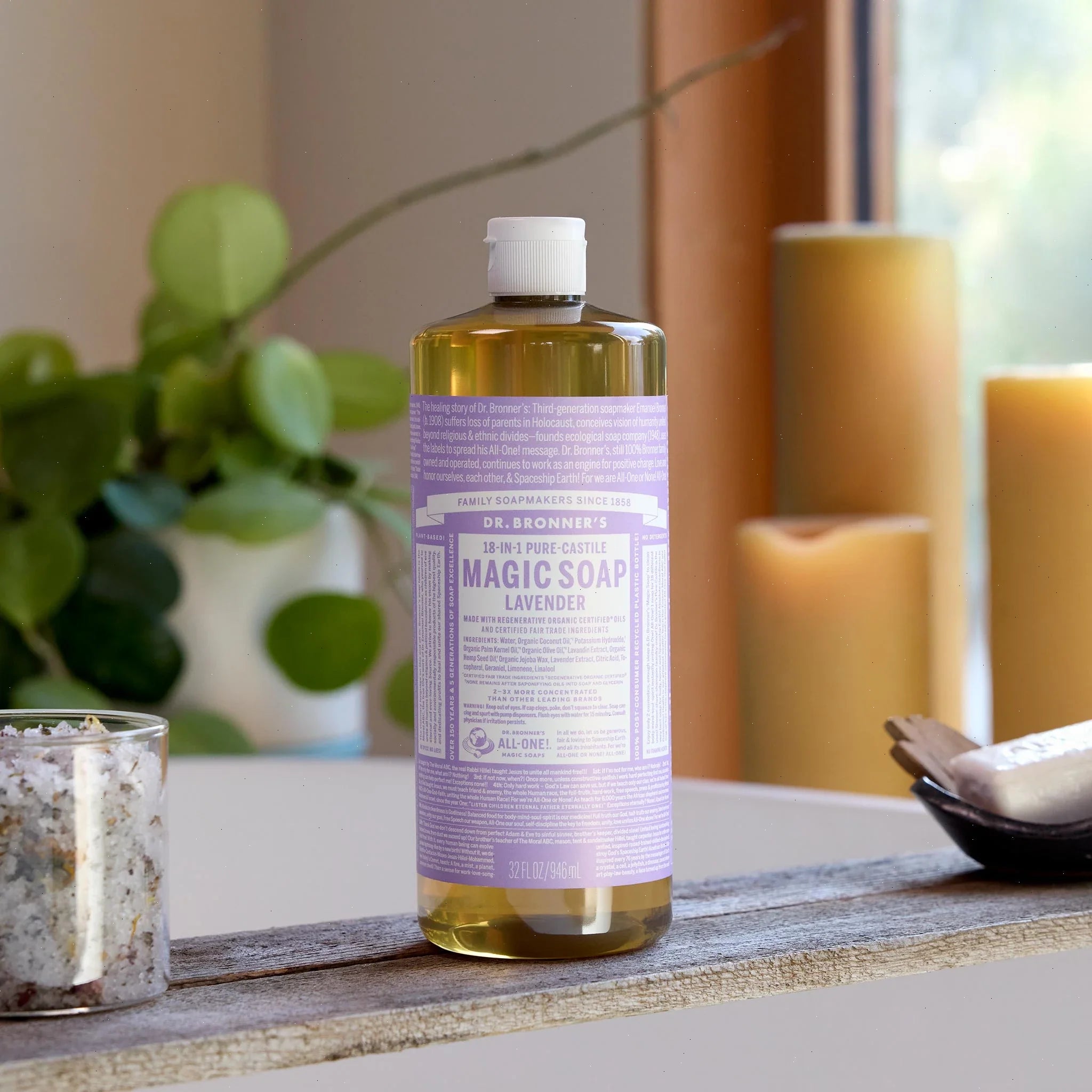 Relax and unwind with the calming scent of Dr. Bronner’s Lavender Liquid Soap. Infused with pure French lavender essential oil, this true soap creates a rich, smooth lather that rinses clean. Made with Regenerative Organic Certified® oils, it gently cleanses while filling the air with a soothing, genuine scent. No detergents, dyes, or added foaming agents. Vegan, made with organic oils, fair trade, and EWG Verified®—for a clean that renews body and soul.