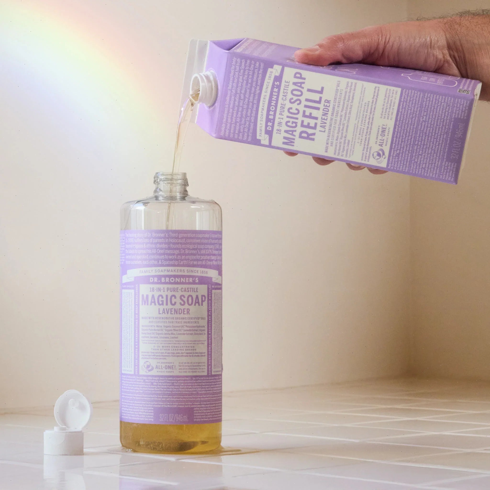 Refill your Dr. Bronner’s 100% Post-Consumer-Recycled bottle, foaming hand soap pump dispenser, and more with our 32oz. Magic Soap Refill Paper Carton! Uses 86% less plastic than one of our 32oz. recycled bottles! Sustainable made easy!