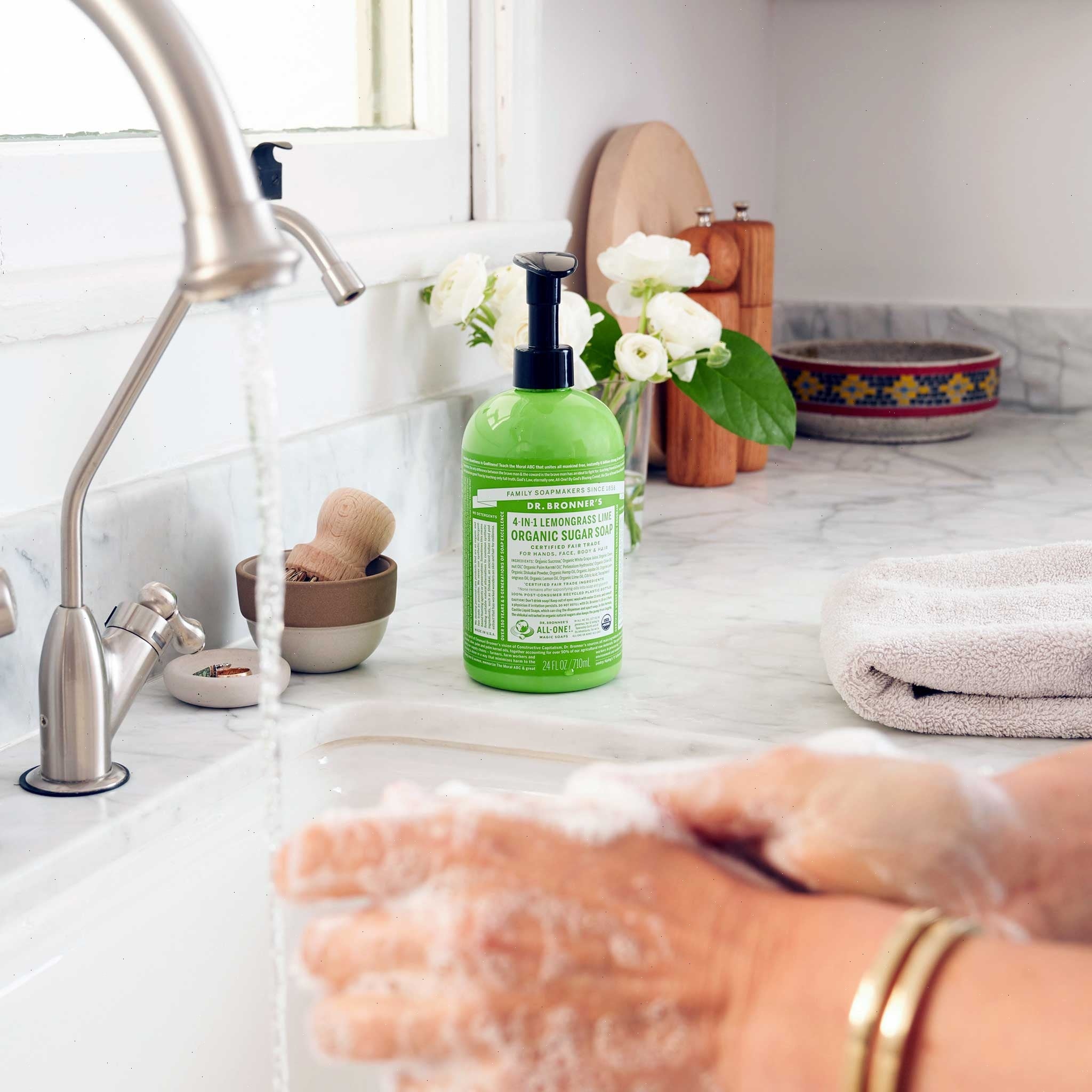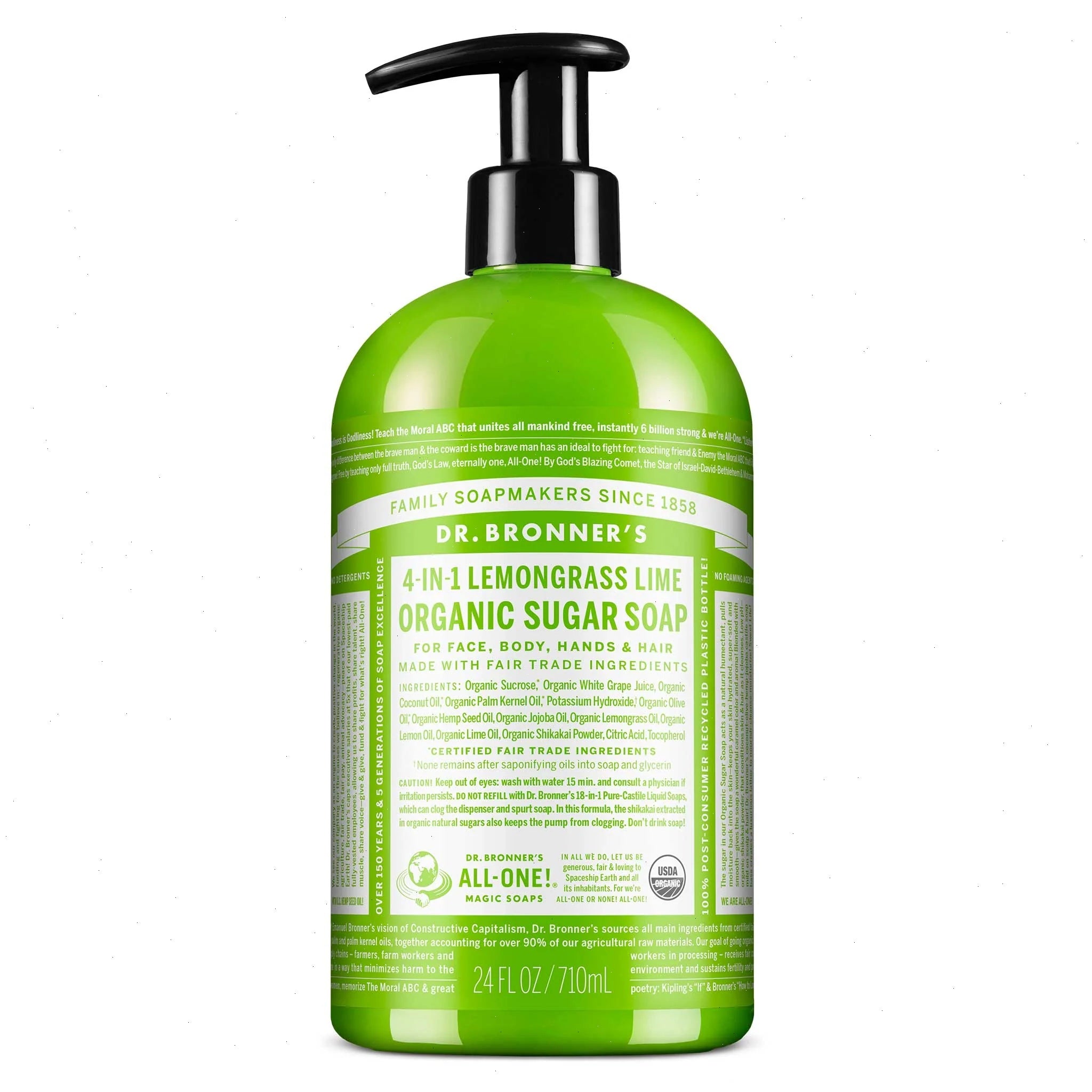 4-in-1 Organic Sugar Soaps are good for washing hands, face, body & hair & place by your sink or in the shower! To wash hair, work one pump of soap into wet hair until it lathers, then rub and rinse. Repeat for thicker or longer hair. After washing, follow up with a lightly acidic conditioning rinse, like Dr. Bronner's Citrus Organic Hair Rinse to leave hair silky smooth! Don't have our Organic Hair Rinse? Use diluted apple cider vinegar or lemon juice! OK!