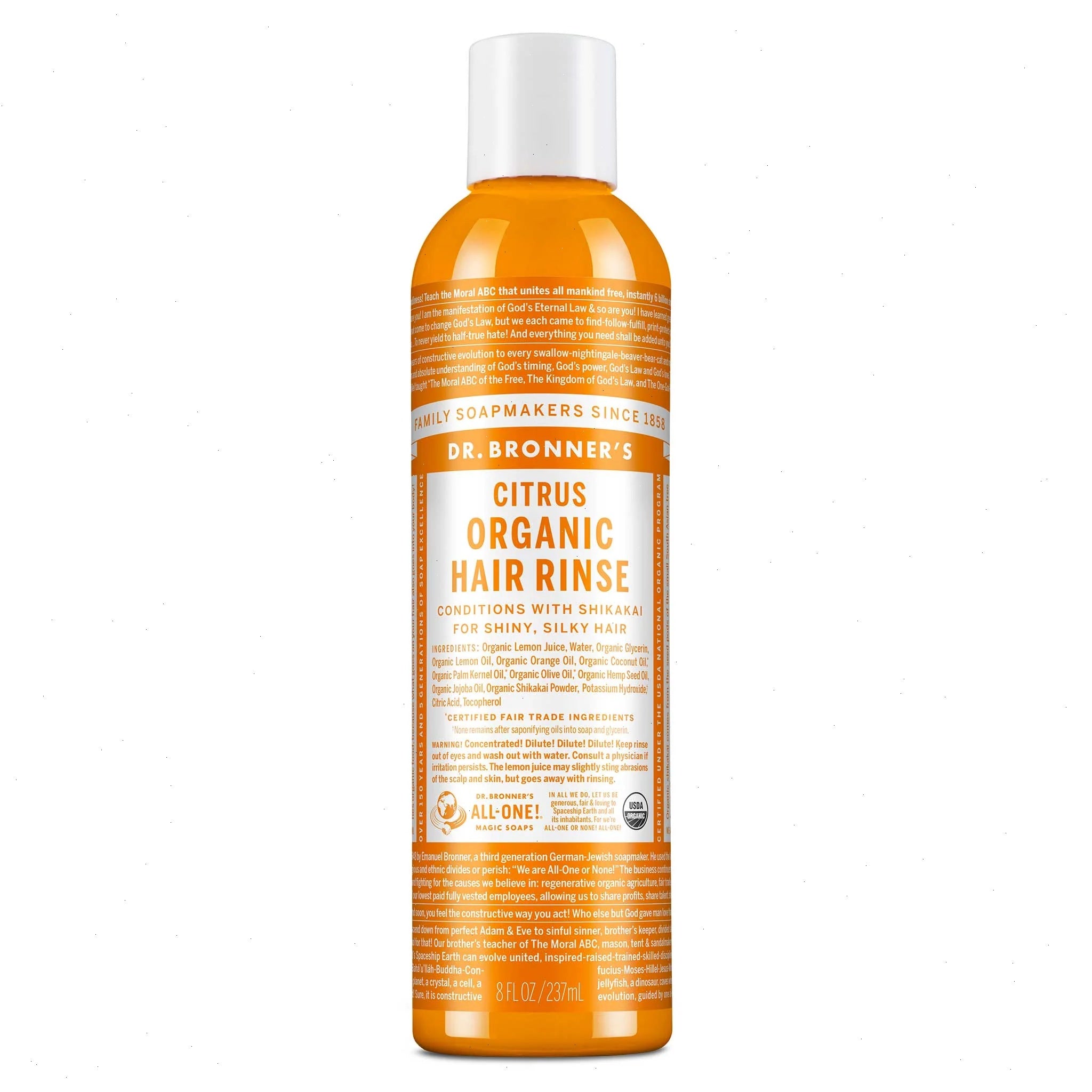 Use Dr. Bronner's Organic Hair Rinse as part of an organic hair care routine, together with any of our soaps! After shampooing with Dr. Bronner's soap, dilute Organic Hair Rinse in 1 cup water and pour it over hair. The citrus extracts in the rinse help to counteract the soap's alkalinity & tamp down the cuticles in your hair & leaving your hair manageable and smooth!