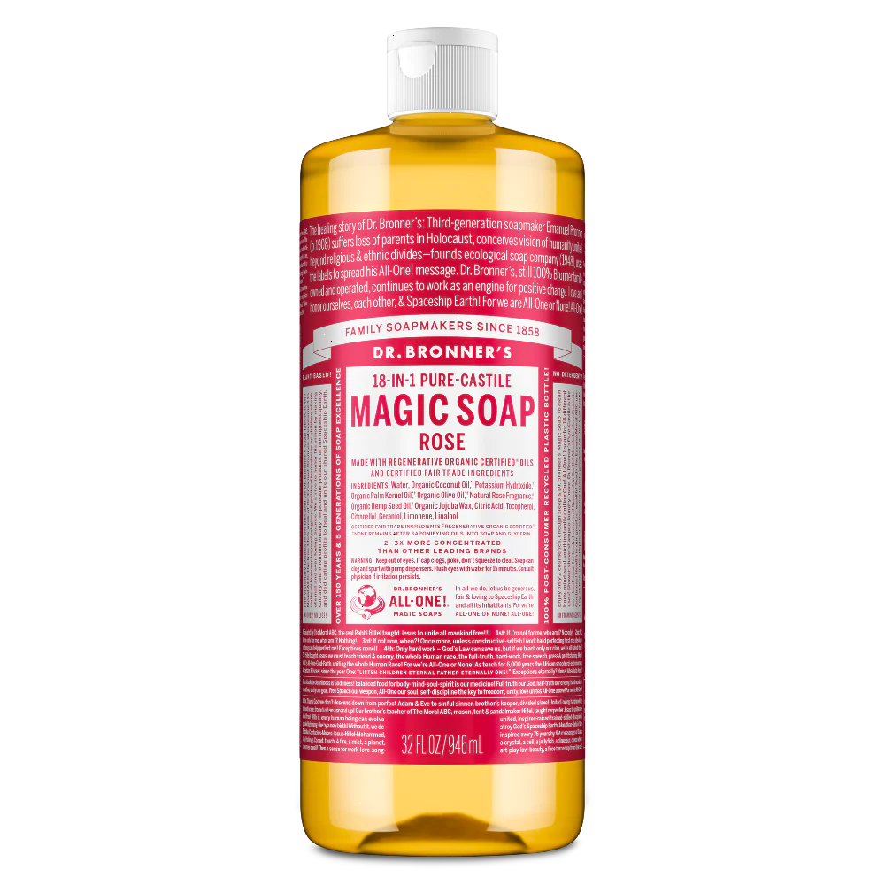 Indulge in the scent of fresh roses with Dr. Bronner’s Rose Liquid Soap. This true soap is infused with a high concentration of naturally derived rose fragrance, leaving skin feeling soft and refreshed. Made with Regenerative Organic Certified® oils, it creates a rich, luxurious lather that cleans while rinsing clean. Crafted with organic, ethically sourced ingredients—no detergents, dyes, or added foaming agents. Vegan, made with organic oils, fair trade, and EWG Verified®—shower with trust!