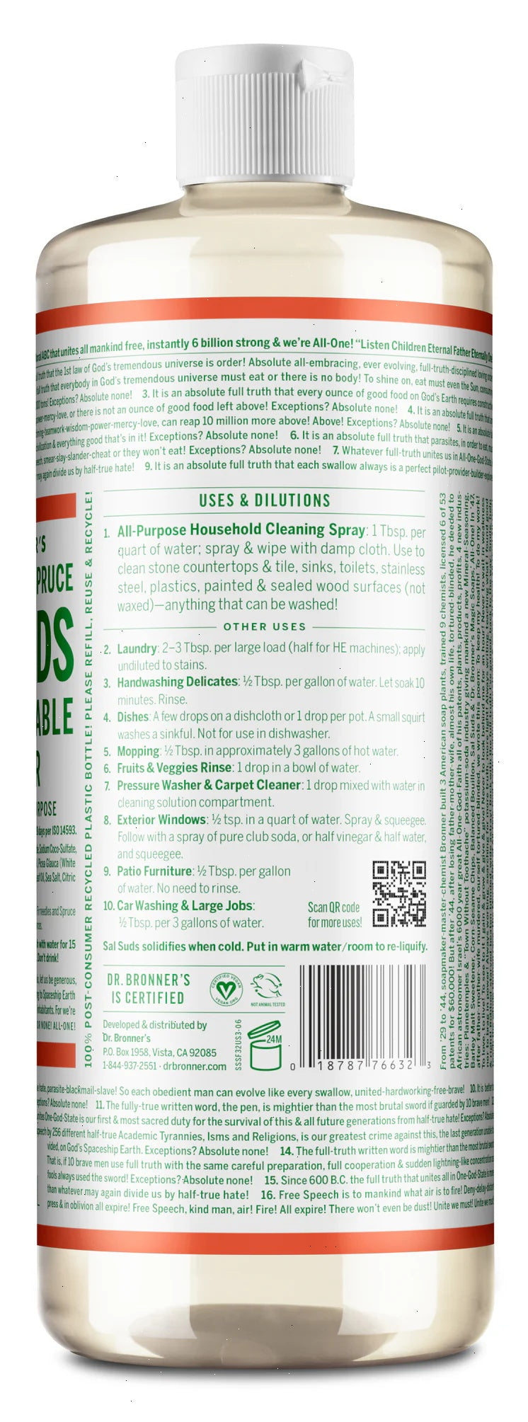 Dr. Bronner's Sal Suds Liquid Cleaner is not a soap but instead is a concentrated hard-surface all-purpose cleaner. It is made with plant-based surfactants and natural fir needle and spruce essential oils (no cheap, harsh pine stump oil), without any synthetic dyes or fragrances. Perfect for general household cleaning (dishes, floors, laundry, etc.), it cleans and rinses with exceptional power, yet it is mild and gentle on the skin. Sal Suds Liquid Cleaner is equally effective in hard or soft water, rinsing freely, hot or cold. Sal Suds is EWG Verified® for peace of mind—because caring for your home should also care for the planet!