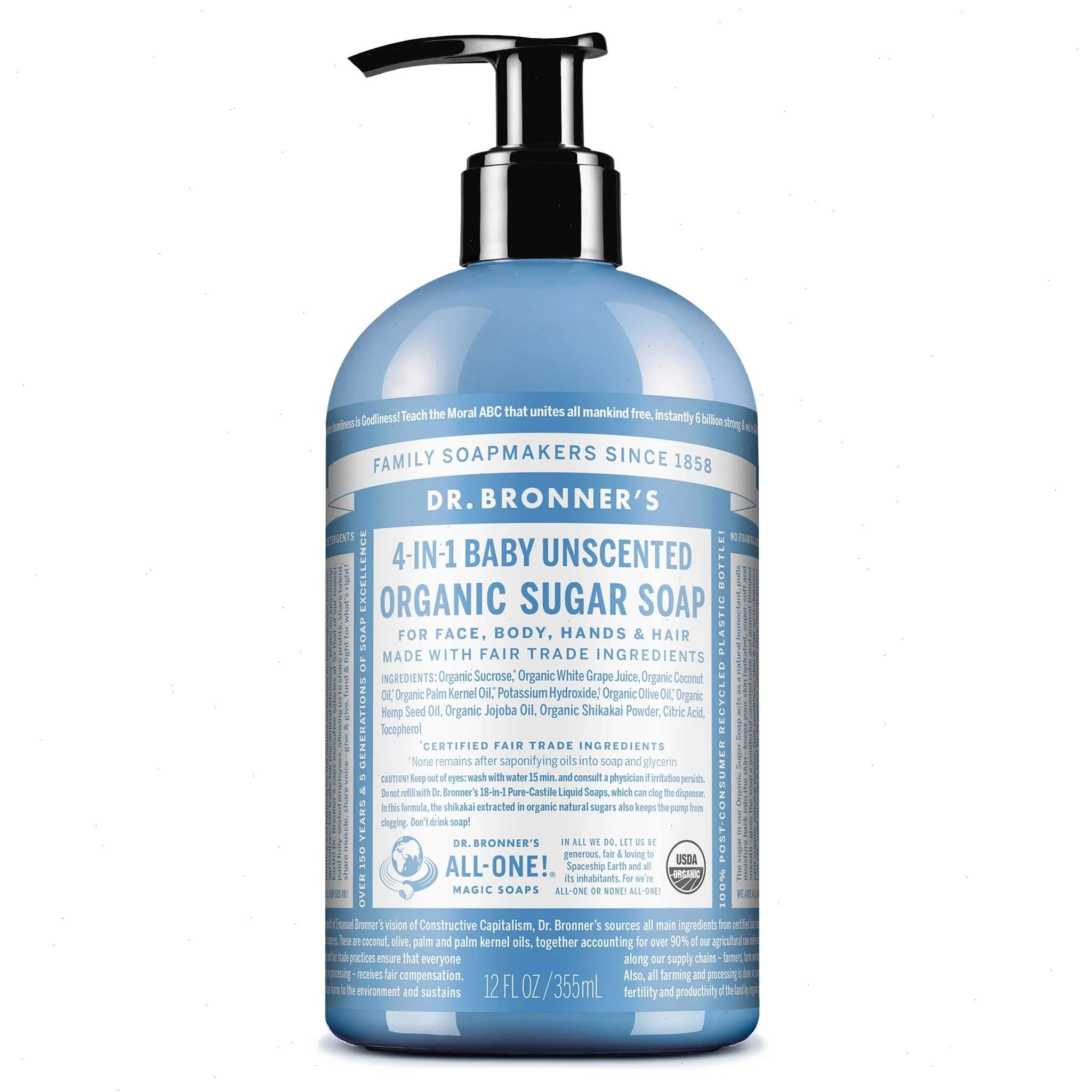 4-in-1 Organic Sugar Soaps are good for washing hands, face, body & hair & place by your sink or in the shower! To wash hair, work one pump of soap into wet hair until it lathers, then rub and rinse. Repeat for thicker or longer hair. After washing, follow up with a lightly acidic conditioning rinse, like Dr. Bronner's Citrus Organic Hair Rinse to leave hair silky smooth! Don't have our Organic Hair Rinse? Use diluted apple cider vinegar or lemon juice! OK!