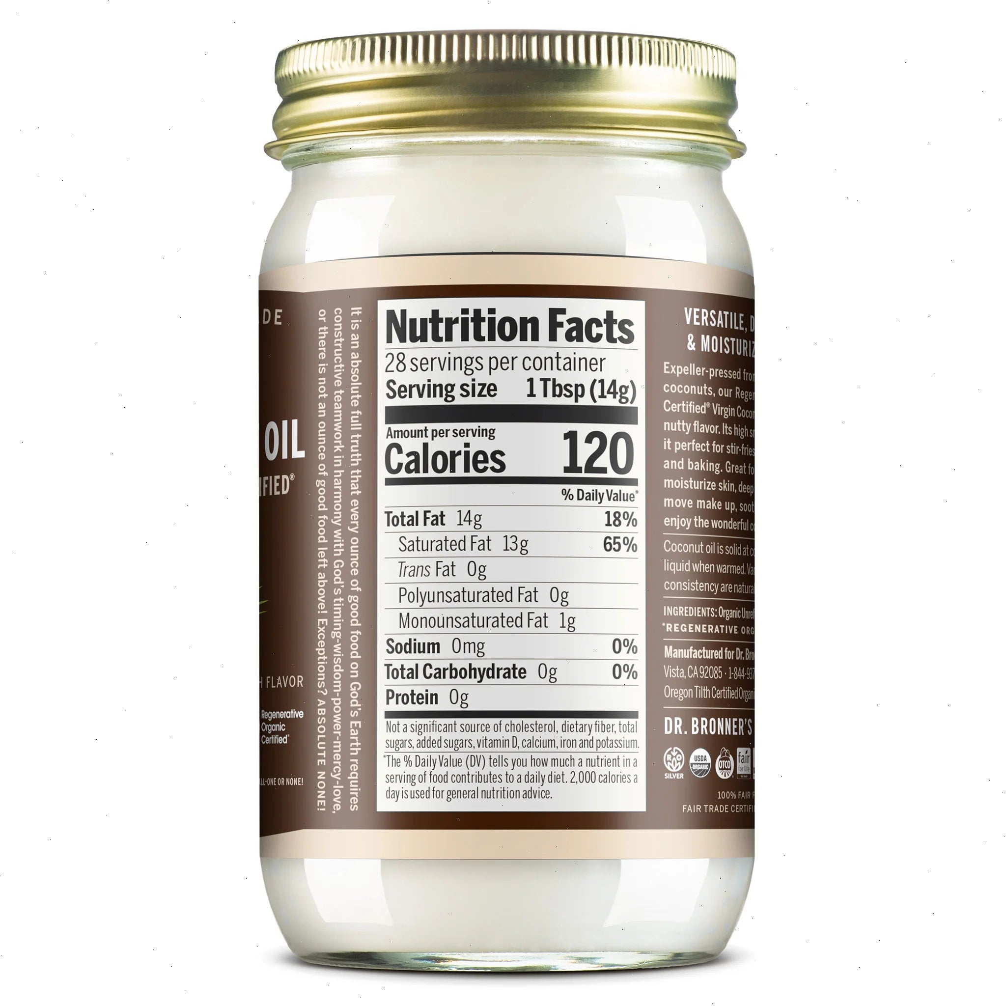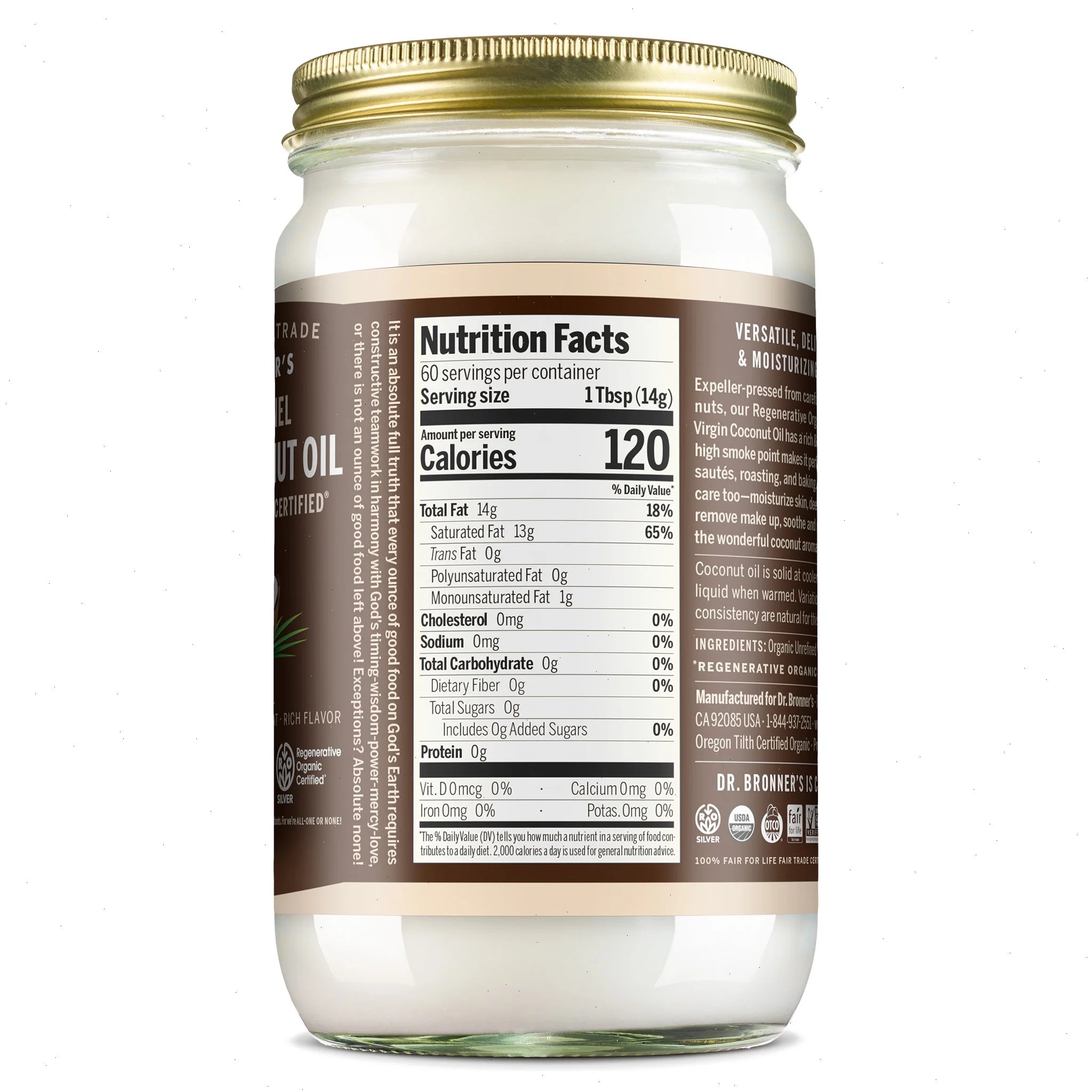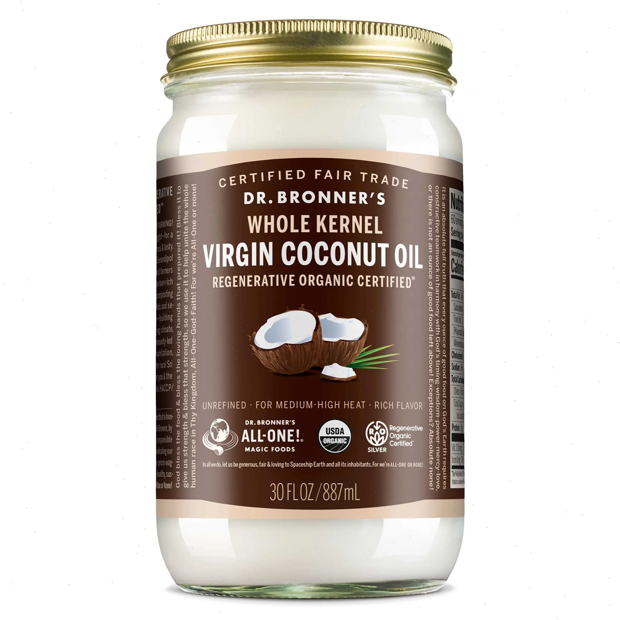 Our rich and nutty regenerative organic coconut oil is perfect for stir-fries, sautes and baking. Great for body care too—use it to revitalize skin, deep condition hair, remove make up, soothe sunburns and massage sore muscles!